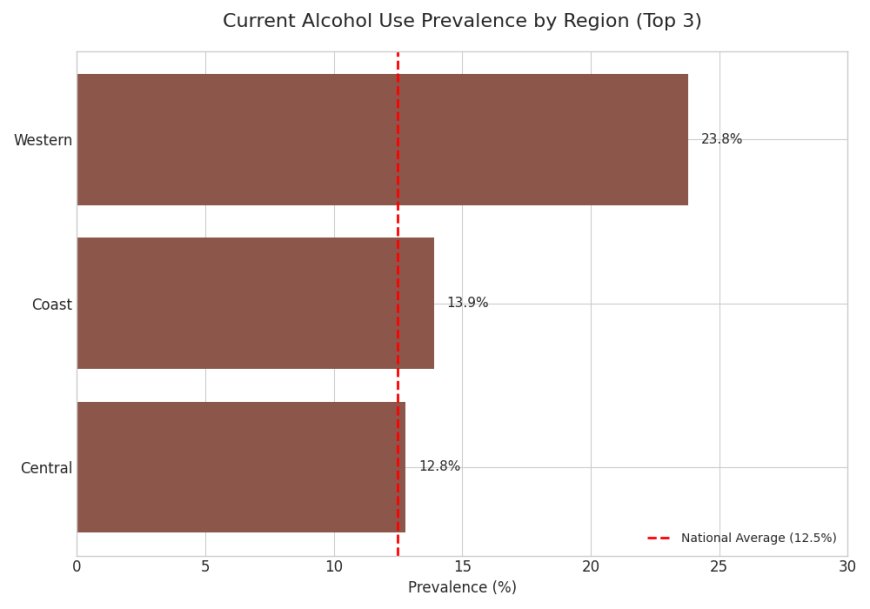 Current alcohol use prevalence by region compared to the national average. Western Kenya records the highest rates, followed by the Coast and Central regions. NACADA