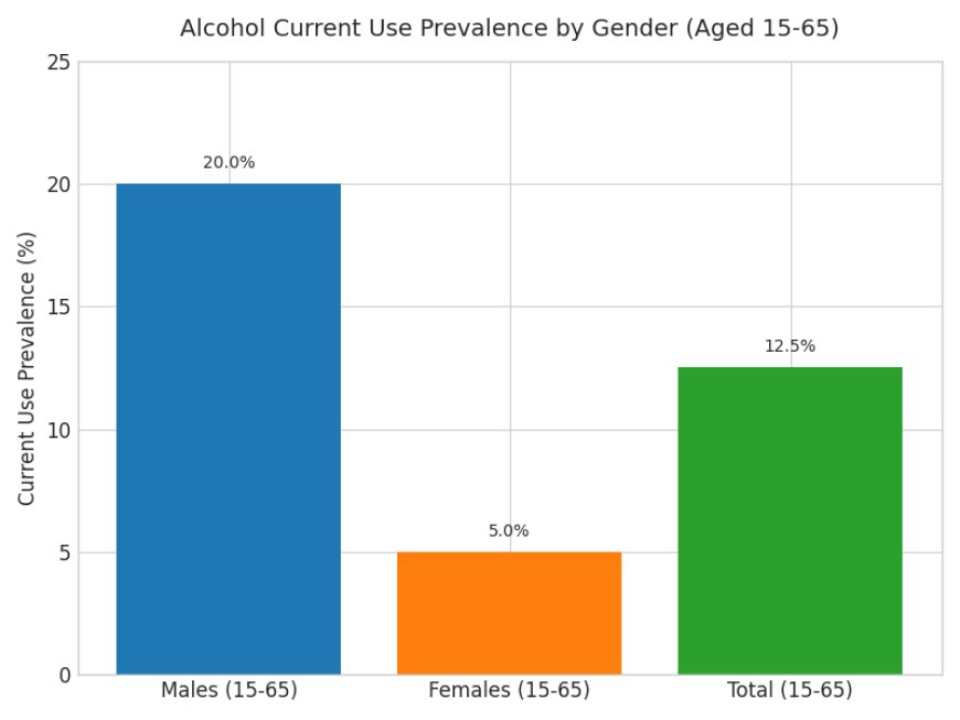 Alcohol use prevalence among Kenyans aged 15–65, showing significant gender disparities. NACADA