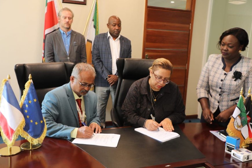 Kakamega County Attorney Vivianne Mbaka looks on as partners sign an MoU at the County Headquarters, alongside French Ambassador Arnaud Suquet and Deputy Governor Ayub Savula.